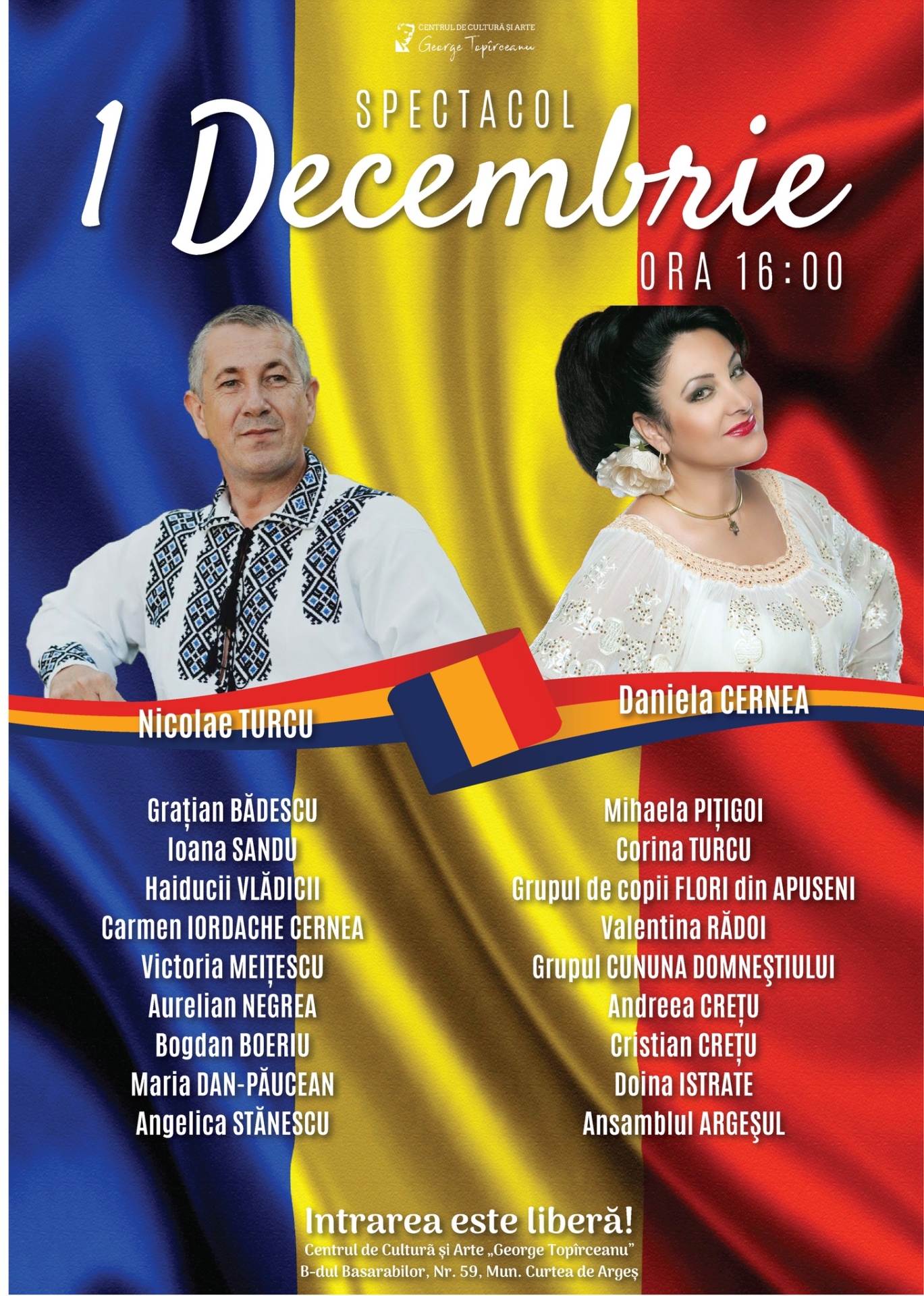 De 1 decembrie, simţim şi cântăm româneşte. Centrul de Cultură şi Arte „George Topîrceanu” organizează un spectacol de cântece patriotice cu interpreţi cunoscuţi la nivel naţional. Vor cânta pentru dumneavoastră Nicolae TURCU, Daniela CERNEA, Graţian BĂDESCU, Angelica STĂNESCU, Haiducii Vlădicii, sau Victoria MEIŢESCU, plus alte multe nume mari ale scenei muzicii populare.