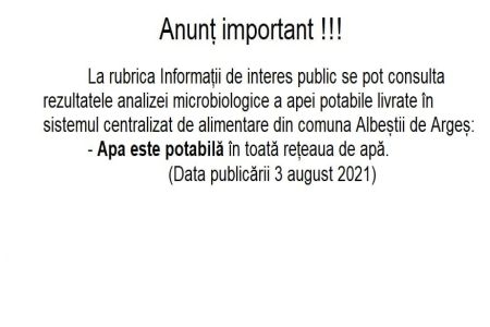 Pe site-ul oficial al primăriei comunei Albeștii de Argeș am publicat rezultatul analizelor microbiologice din trimestrul III 2021; apa este potabilă în toată rețeaua centralizată din comună.