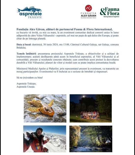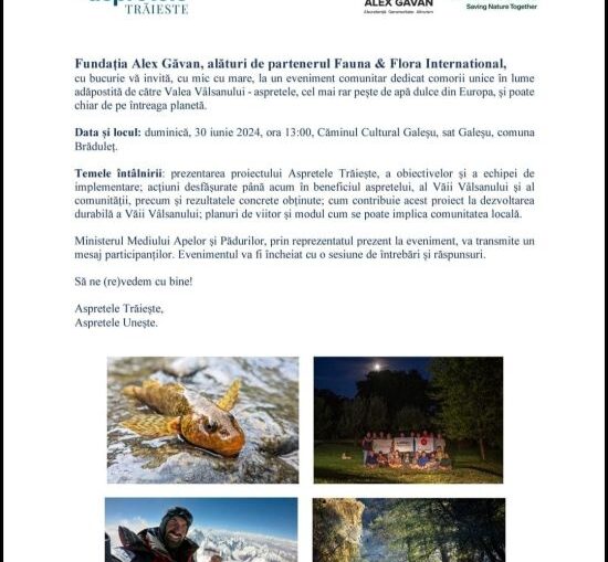 Duminică, 30 iunie, orele 13:00, la Căminul Cultural Galeşu, va avea loc prezentarea proiectului „Aspretele Trăiește”, de către Fundația Alex Găvan, alaturi de partenerul Fauna&Flora.