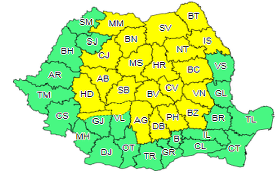 COD GALBEN În intervalul 06.05.2019 ora 16:00 – 07.05.2019 ora 24:00 pe râurile din bazinele hidrografice: Vişeu, Iza, Lăpuş (judeţul Maramureş), Someşul Mare (judeţul Bistriţa Năsăud), Mureş – bazin superior amonte S.H. Glodeni (judeţele Harghita şi Mureş), Târnava Mică, Târnava Mare (judeţele Harghita, Mureş şi Sibiu), Mureş – afluenţii aferenţi sectorului aval confluenţă Târnava – amonte S.H. Radna (judeţele Alba, Hunedoara şi Arad), Gilort – bazin superior (judeţul Gorj), Olt – bazin amonte S.H. Hoghiz (judeţele Harghita, Covasna şi Braşov), afluenţii Oltului aferenţi sectorului aval S.H. Hoghiz – amonte Ac. Ioneşti (judeţele Braşov, Sibiu, Argeş şi Vâlcea), Olteţ – bazin superior (judeţele Gorj şi Vâlcea), Vedea – bazin superior şi afluenţi bazin mijlociu şi inferior (judeţele Argeş, Olt şi Teleorman), Argeş – bazin superior şi afluenţi bazin mijlociu şi inferior (judeţele Argeş, Dâmboviţa, Ilfov şi Giurgiu), Ialomiţa – bazin amonte S.H. Coşereni (judeţele Dâmboviţa, Prahova, Ialomiţa şi Ilfov), Buzău – bazin superior şi afluenţi bazin mijlociu (judeţele Braşov, Covasna şi Buzău), Putna – bazin superior (judeţul Vrancea), Trotuş – bazin superior şi afluenţi bazin mijlociu şi inferior (judeţele Harghita, Neamţ, Bacău şi Vrancea), Bistriţa – bazin superior şi afluenţi bazin mijlociu şi inferior (judeţele Harghita, Suceava, Neamţ şi Bacău), Moldova – bazin superior şi afluenţi bazin mijlociu şi inferior (judeţele Suceava şi Neamţ), Suceava – bazin superior şi afluenţi bazin mijlociu şi inferior (judeţul Suceava), Jijia – bazin superior şi afluenţi bazin mijlociu şi inferior (judeţele Botoşani şi Iaşi).