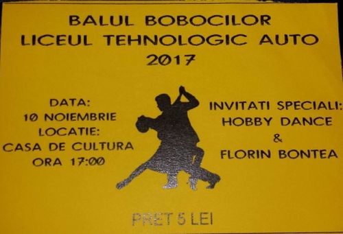 Liceul Tehnologic Auto are plăcerea sa va invite la Balul Bobocilor 2017. Evenimentul va fi organizat la Centrul de Cultură si Arte „George Topârceanu” ,iar ușile se vor deschide începând cu orele 17:00. De asemenea ,surprizele continuă şi veți avea plăcerea de vă încânta privirile cu tinerii trupei „Hobby Dance” (Vlad Lazăr şi Teodora Pavel); Bontea Ion Florin.