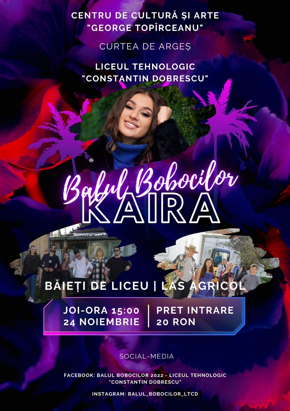 Joi 24 noiembrie ora 15:00, Centrul de Cultură și Arte,,George Topîrceanu,, – Curtea de Argeș, găzduiește Balul Bobocilor 2022 Liceul Tehnologic ,,Constantin Dobrescu,,. Invitată specială Kaira. Biletele se pot procura în ziua balului la intrare. Preț bilet 20 lei.