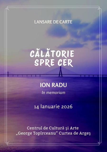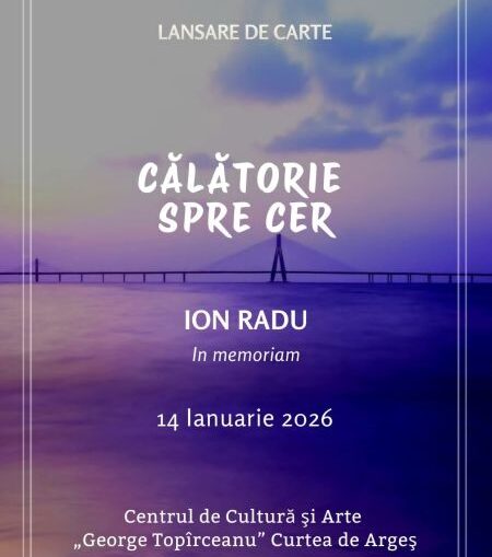 Vă invităm cu drag la evenimentul de lansare de carte „Călătorie spre cer” in memoriam Ion Radu, care va avea loc la Centrul de Cultură și Arte „George Topîrceanu” Curtea de Argeș, în data de 14 Ianuarie 2026, ora 17.00.