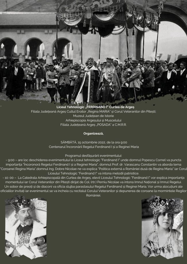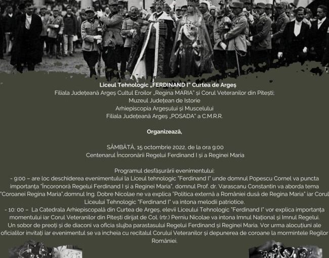 Sâmbătă 15 Octombrie 2022 argeșenii sunt invitați la evenimentul dedicat ”Centenarului Încoronării Regelui Ferdinand I”, activitate ce se va desfășura în orașul regal Curtea de Argeș, la Liceul Tehnologic “ Ferdinand I” și Catedrala Arhiepiscopală.