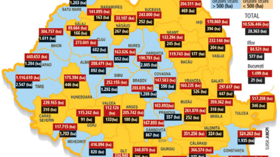 În România, cetăţenii străini deţin pe persoană fizică peste 28.000 de hectare de teren, o suprafaţă echivalentă cu două oraşe mari precum Timişoara şi Cluj-Napoca, sau chiar Bucureştiul şi o comună de lângă el, potrivit unei analize ZF pe baza datelor Agenţiei Naţionale de Cadastru şi Publicitate Imobiliară (ANCPI). Agenţia nu are date privind suprafeţele de teren agricol deţinute de persoane juridice controlate de investitori străini. În urmă cu patru ani, în 2021, străinii aveau în România 21.050 de hectare în total. Acum, vedem în cifre o expansiune, datorată şi accesului la resursele funciare, care conturează un fel de oraş „invizibil“, răspândit în zone rurale, în aproape 34.000 de parcele.