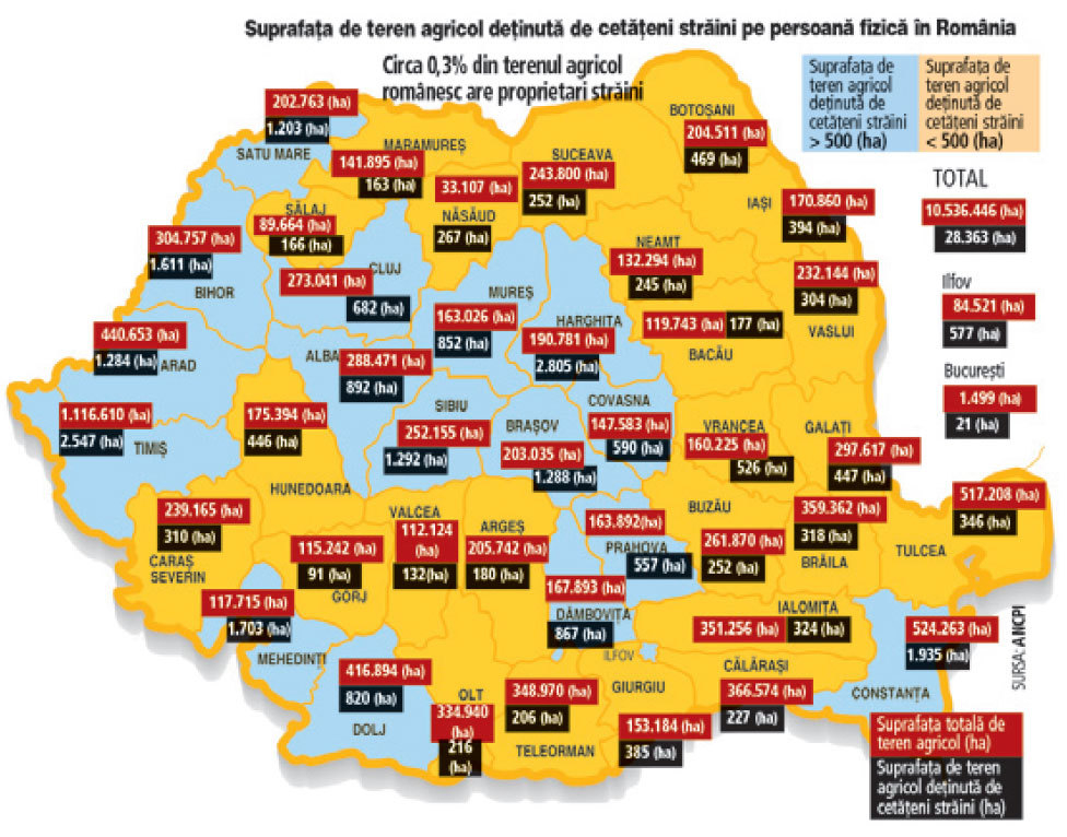 Cetăţenii străini cumpără terenuri în România. În doar patru ani suprafaţa de teren deţinută de persoane fizice din afara ţării a crescut cu 33%. Datele privind investitorii străini persoane juridice sunt o enigmă. Agenţia Naţională de Cadastru nu are date privind suprafeţele de teren agricol deţinute de persoane juridice controlate de investitori străini