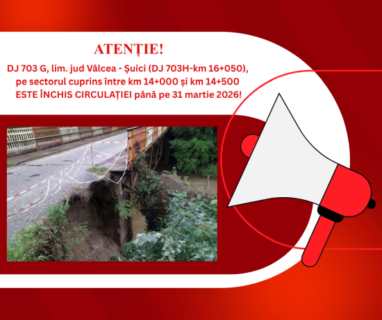 Regia Autonomă Județeană de Drumuri Argeș R.A., în calitate de administrator al drumurilor județene, reamintește participanților la trafic că circulația rămâne închisă pe drumul județean DJ 703G, Lim. jud Vâlcea – Șuici (DJ 703H-km 16+050), km 14+000-19+965, pe sectorul cuprins între km 14+000 și km 14+500, L= 500 m, până la data de 31 martie 2026.