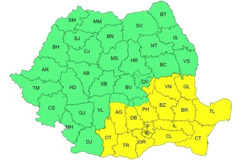 COD GALBEN: majoritatea regiunilor, inclusiv sudul Moldovei, Muntenia, Carpații de Curbură, sud-estul Olteniei și Dobrogea