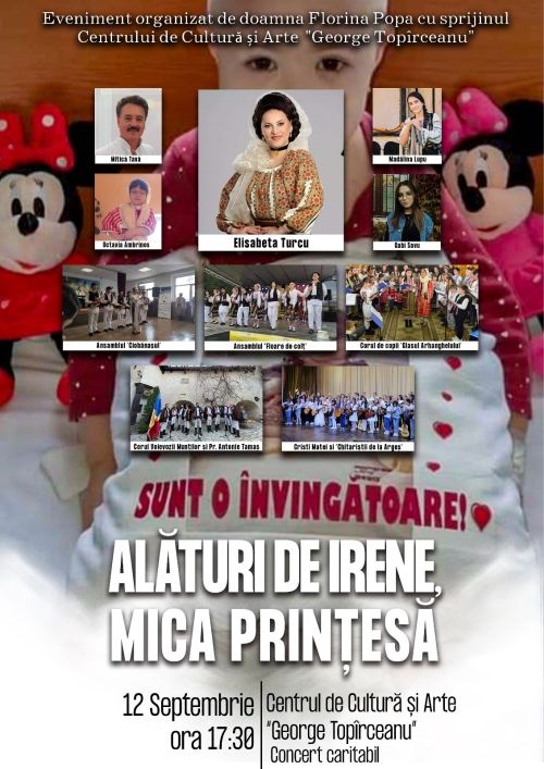 Luni, 12 septembrie, Centrul de Cultură și Arte ”George Topîrceanu” găzduiește un spectacol caritabil ce are ca scop strângerea de fonduri pentru a ajuta o fetiță diagnosticată cu leucemie mieloblastică, dar care sufera și de sindromul Down.