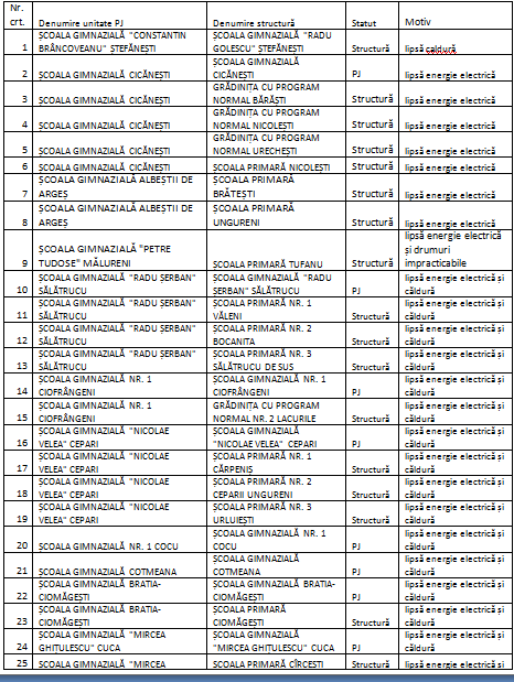 Ca urmare a condițiilor meteorologice nefavorabile, vă transmitem situația școlilor din judeţul Argeș care au anunțat suspendarea cursurilor în data de 19.12.2018 – raportare ora 09.00.