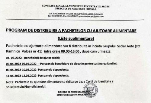 Primăria Curtea de Argeș, prin Direcția de Asistență Socială Curtea de Argeș, anunță următoarele :