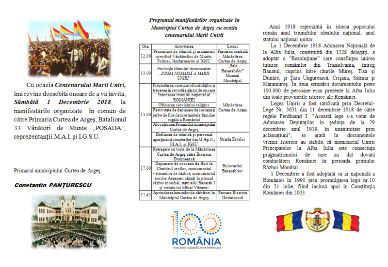 ”Programul manifestărilor organizate în Municipiul Curtea de Argeş cu ocazia Centenarului Marii Unirii: