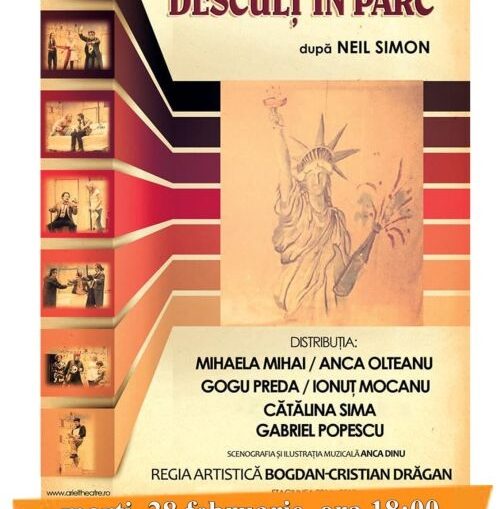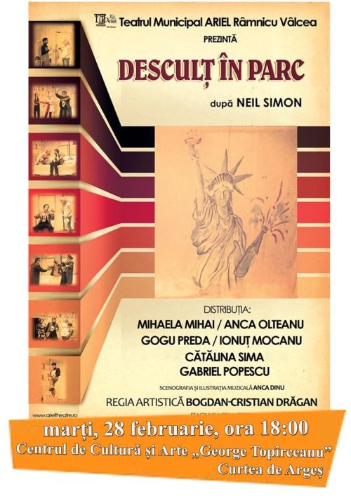 Astăzi ne vedem la teatru. „Desculţ în parc”, în interpretarea actorilor de la Teatrul Ariel din Râmnicu Vâlcea, se joacă de la ora 18.00 pe scena Centrului de Cultură şi Arte „George Topîrceanu” din Curtea de Argeş.