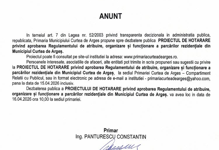 Dezbatere publică – Regulamentul de atribuire, organizare și funcționare a parcărilor rezidențiale din Municipiul Curtea de Argeș