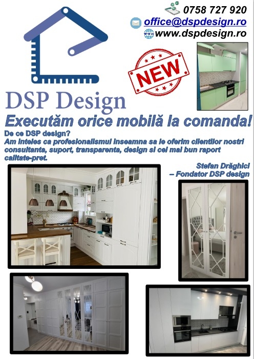 Informații suplimentare la telefon 0758 727 920, iar oferta noastră o puteți vedea și online, pe site-ul nostru: www.dspdesign.ro