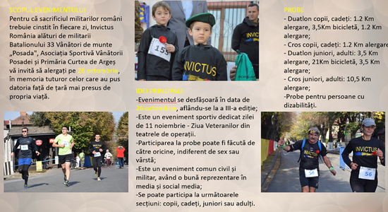Pentru că sacrificiul militarilor români trebuie cinstit în fiecare zi, militarii Batalionului 33 Vânători de Munte „Posada” alături de Asociația Sportivă Vânătorii Posadei, Invictus România și Primăria Municipiului Curtea de Argeș vă invită să alergați pe 26 octombrie în memoria tuturor celor care au pus datoria față de țară mai presus de propria viață.