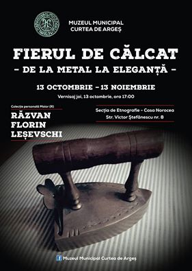 Muzeul Municipal Curtea de Argeș are plăcerea să vă invite joi, 13 octombrie, orele 17.00, la vernisajul expoziției itinerante: „Fierul de călcat – de la metal la eleganță”. Cu această ocazie, la Secția de Etnografie a Muzeului, situată în incinta Casei Dumitru Norocea, din Str. Victor Ștefănescu nr. 8, vor fi expuse peste 50 de modele de fiare de călcat, din secolele XIX-XX. Obiectele fac parte dintr-o colecție privată, aparținând domnului Maior (R) Răzvan Florin Leșevschi.