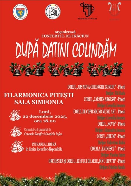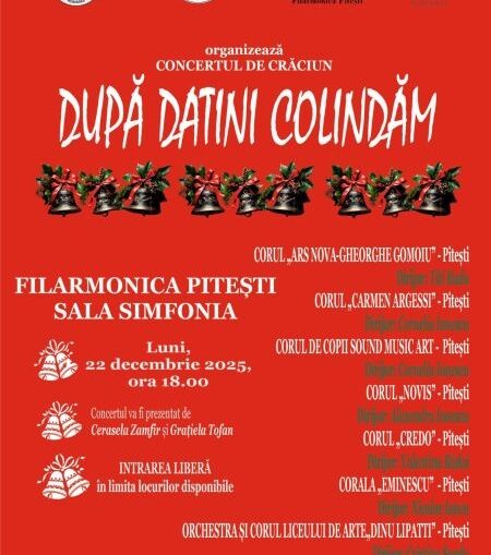 Vă invităm la Concertul de Crăciun „După datini colindăm”, astăzi, ora 18:00, la Filarmonica Pitești – Sala Simfonia.