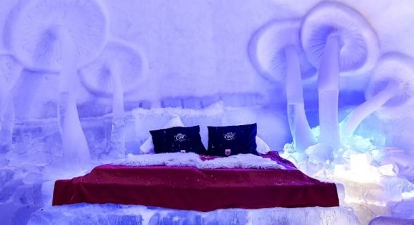 ”Locul ideal pentru a avea un somn liniștior, profund și odihnitor pe un pat de gheață. Patul este echipat cu perne, blănuri de animale și mai multe straturi de pături pentru confort termic. Temperatura camerei oscilează între 0 și – 2 grade Celsius. Camera conține o masă de gheață pentru bagaje și o veioză cu întrerupător și un pat de dimensiunea 2 metri /1,60 cm ideal pentru 2 persoane. Camerele folosesc ca ușă 2 perdele care se pot închide și care delimitează spațiul restaurantului de cameră. Nu conțin prize,” este descrierea pentru cei care doresc să se cazeze la Hotelul de la Bâlea Lac, pentru câteva sute de lei pe noapte.