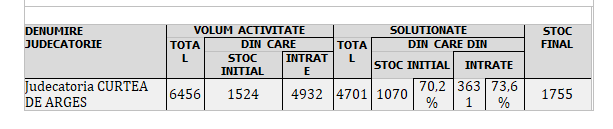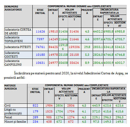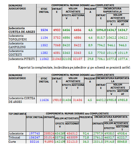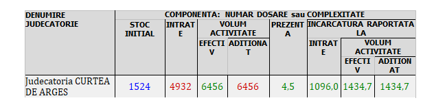 Judecătoria Curtea de Argeș este, de altfel, singura judecătorie din județul Argeș care, prin prisma încărcăturii pe judecător/complexitate cauze (6985,8), se situează peste media tribunalelor din raza Curții de Apel Pitești (6222,7)!
