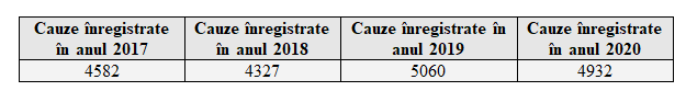 Se constată că, numărul de dosare nou intrate rămâne unul destul de ridicat, superior valorilor înregistrate în anii 2017 şi 2018 însă uşor redus prin comparaţie cu cauzele noi înregistrate în cursul anului 2019.