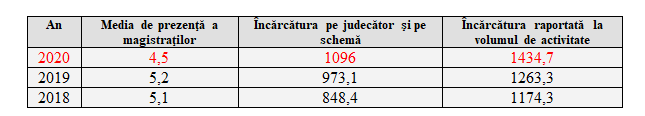 În cursul anului 2020 încărcătura pe judecător şi pe schemă, precum şi încărcătura raportată la volumul de activitate a fost net superioară celei din anii precedenţi, în special datorită creșterii numărului de dosare nou-intrate și a mediei scăzute de prezenţă în ceea ce priveşte magistraţii.