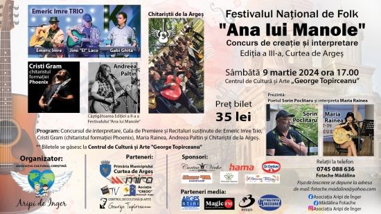 Evenimentul este organizat de Asociația Cultural Creștină Aripi de Inger, din Curtea de Argeș, reprezentant legal Fotache Maria Magdalena, in data de 09.03.2024 la Centrul de Cultură și Arte „George Topîrceanu”. Prin acest festival ne-am propus să promovăm orașul Curtea de Argeș și să oferim șansa copiilor și tinerilor să cânte alături de nume sonore ale folkului: Emeric Imre cu trupa și Cristi Gram de la formația Phoenix. De asemenea copiii și tinerii câștigători vor primi din partea Asociației Cultural Creștină Aripi de Înger și sponsorilor, premii in bani și cadouri.