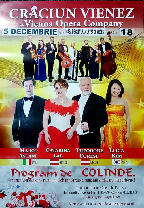 Sub genericul “Crăciun Vienez”, Centrul de Cultură şi Arte „George Topîrceanu” va fi gazda unui spectacol ce nu trebuie pierdut, organizat în data de 5 decembrie. Artişti de renume, Marco Ascani din Italia, Catarina Lal şi Theodore Coresi din Austria, precum şi Lucia Kim, din Coreea, vor încânta publicul cu colinde, muzică vieneză din creaţia lui Johann Strauss, romanţe şi şlagăre nemuritoare.