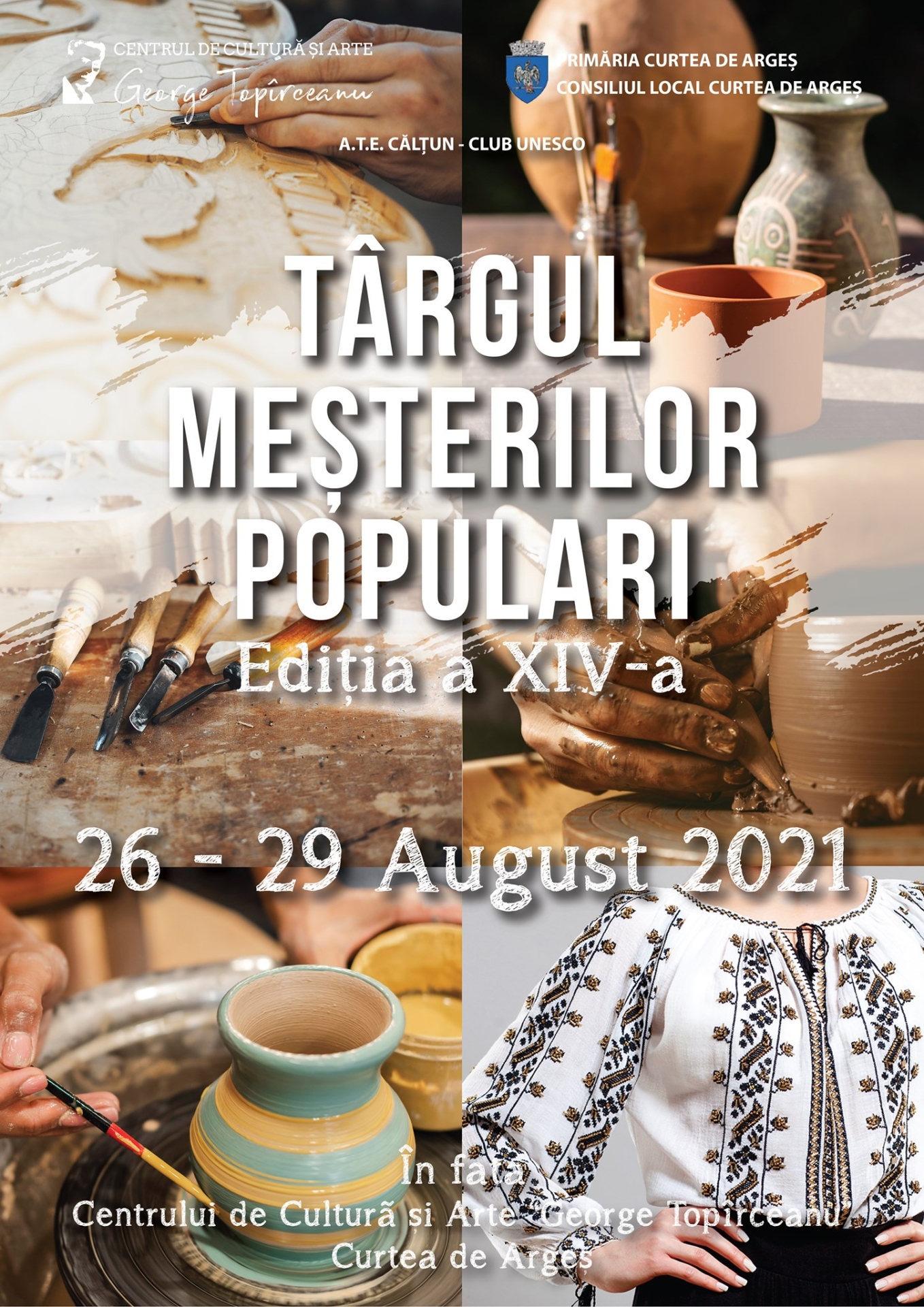 Cea de-a XIV-a ediţie a Târgului Meşterilor Populari va debuta joi la Curtea de Argeş, în faţa Centrului de Cultură şi Arte „George Topîrceanu”. Pe lângă obiectele realizate de meşteri, publicul se va bucura şi de muzică de calitate şi de o serie de surprize. Vă aşteptăm, de joi până duminică, pe tot parcursul zilelor, să apreciem arta şi produsele realizate de meşterii populari din toată ţara.