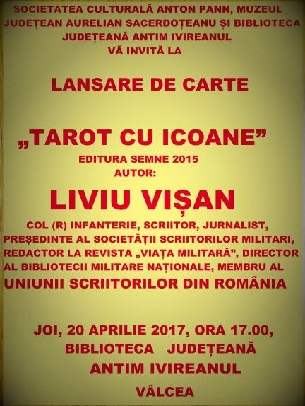 Societatea Culturală Anton Pann în parteneriat cu Muzeul județean Aurelian Sacerdoteanu si Biblioteca Judeteană Antim Ivireanul va organiza joi, 20 aprilie 2017, ora 17.00, în sala de conferinte a Bibliotecii Judetene Antim Ivireanul, lansarea volumului de versuri ”Tarot cu icoane” (volum premiat cu Premiul Antares al U.S.R. în anul 2016), sub semnătura domnului colonel în rezervă Liviu Vișan.