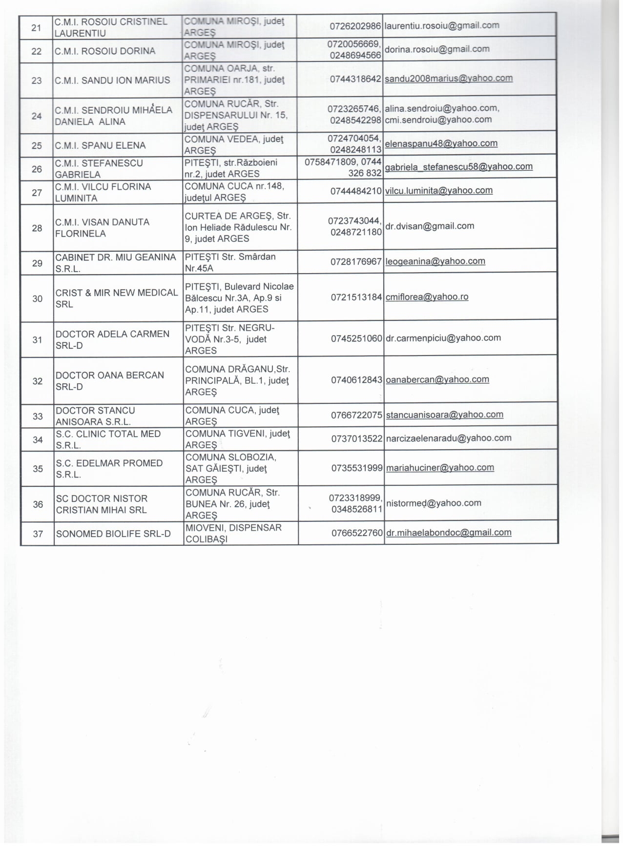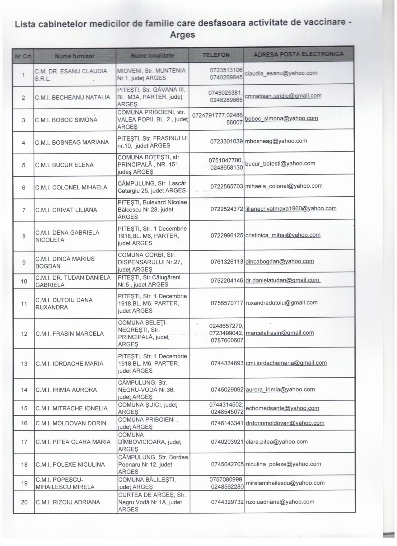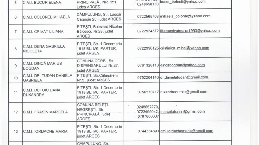 Lista medicilor de familie, care desfasoara activitate de vaccinare cu vaccin Janssen (Jhonson & Jhonson), din judetul Arges. Aceasta lista cuprinde medicii de familie care au solicitat doze de vaccin pana la data de 12.05.2021.