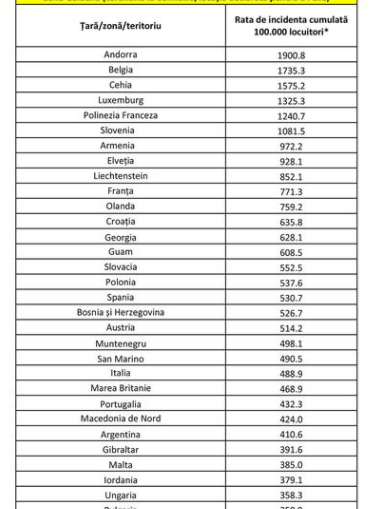 A fost acualizată Lista țărilor/zonelor cu risc epidemiologic ridicat, conform Hotărârii nr. 51 din 02.11.2020 privind aprobarea listei țărilor/zonelor/teritoriilor de risc epidemiologic pentru care se instituie măsura carantinei asupra persoanelor care sosesc în România din acestea și modificarea valorii ratei de incidență cumulată a cazurilor în ultimele 14 zile de la care este obligatorie purtarea măștii de protecție în toate spațiile deschise.