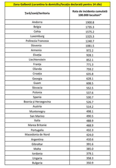 ZONĂ GALBENĂ (carantina la domiciliu/locația declarată pentru 14 zile): Andorra, Belgia, Cehia, Luxemburg, Polinezia Franceza, Slovenia, Armenia, Elveția, Liechtenstein, Franța, Olanda, Croația, Georgia, Guam, Slovacia, Polonia, Spania, Bosnia și Herzegovina, Austria, Muntenegru, San Marino, Italia, Marea Britanie, Portugalia, Macedonia de Nord, Argentina, Gibraltar, Malta, Iordania, Ungaria, Bulgaria.