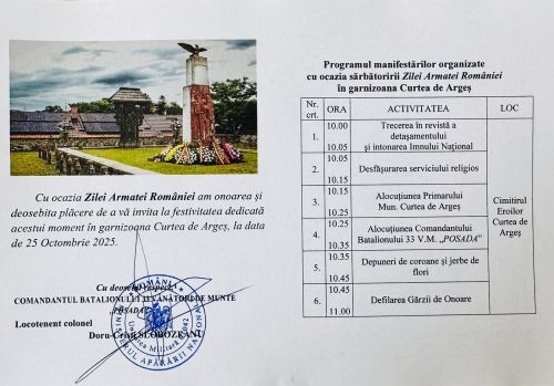 Cu prilejul Zilei Armatei României, în garnizoana Curtea de Argeș vor avea loc sâmbătă, 25 octombrie 2025, manifestări comemorative și militare la Cimitirul Eroilor din municipiu.