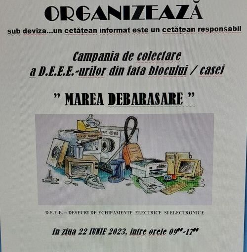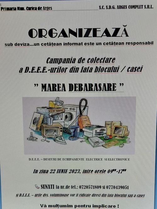 Primăria Curtea de Argeș și SC SDG Argeș Complet SRL organizează joi, 22 iunie, între orele 09.00- 17.00, o nouă campanie de colectare a deșeurilor electrice și electronice (DEEE). Cetățenii care au astfel de deșeuri voluminoase trebuie să sune la 0720571809 sau 0770439051, iar obiectele vor fi luate direct din fața blocului sau a casei! Vă mulțumim pentru implicare!