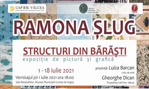 Vernisajul expoziției personale de pictură și grafică „Structuri din Bărăști” semnată Ramona Șlug are loc joi, 1 iulie 2021, la Muzeul Municipal Curtea de Argeș. Iubitorii de frumos sunt invitați în Sala Basarab a muzeului de la ora 18.00. Expoziția va putea fi admirată pe simezele de la Muzeul Municipal în perioada 1 – 18 iulie.