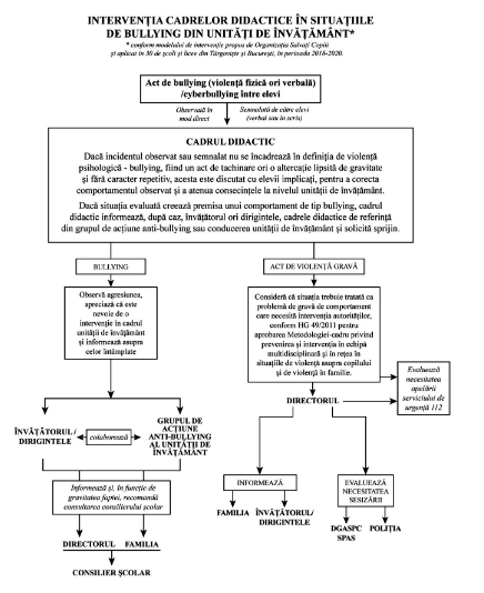 Pentru a face cunoscute modalitățile de intervenție în cazul de bullying, începând cu anul școlar 2020-2021, unitățile de învățământ preuniversitar pot afișa infografice accesibile tuturor copiilor, cadrelor didactice, personalului auxiliar și părinților.