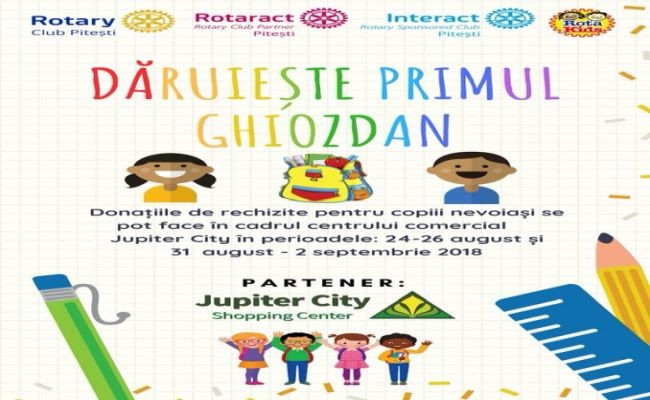 ”La inițiativa colegilor noștri mai tineri din Interact Pitești, toate cele 4 cluburi din Familia Rotary Pitești (RotaKids, Interact, Rotaract Piteşti și Rotary Club Pitești), în parteneriat cu Centrul Comercial Jupiter City Pitești, vă așteaptă în următoarele 2 week-end-uri, începând de vineri 24 august 2018, ora 14, în Jupiter City, pentru a „Dărui Primul Ghiozdan”. Beneficiarii ghiozdanelor cu rechizite colectate sunt copiii nevoiași ce încep acum clasa pregătitoare în școlile din zonele rurale ale județului Argeș. Vă invităm ca din surplusul nostru să Investim în Educație, Dăruind Primul Ghiozdan”, transmite Olimpia Doru, unul dintre oamenii importanți de afaceri din județul nostru, care s-a implicat în numeroase campanii umanitare!