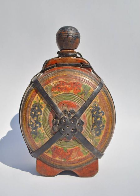 Cercul este un motiv decorativ cu o vechime ancestrală, considerat o reprezentare solară, simbol al perfecţiunii, al infinitului şi al unităţii. Cercurile concentrice sunt asociate cu ierarhiile fiinţei umane. Ciorchinii de struguri de culoare albastru de Prusia contrastează cu roşul viu al buchetelor de flori. Plosca are un dop de lemn care pe alocuri prezintă mici urme de deteriorare, precum şi porţiuni lipsă.