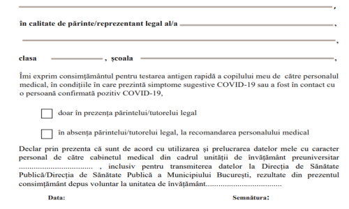Despre formularul de exprimare a consimțământului pentru testarea în școli cu teste rapide antigen, Ministerul Sănătății a revenit cu următoarea adresă:
