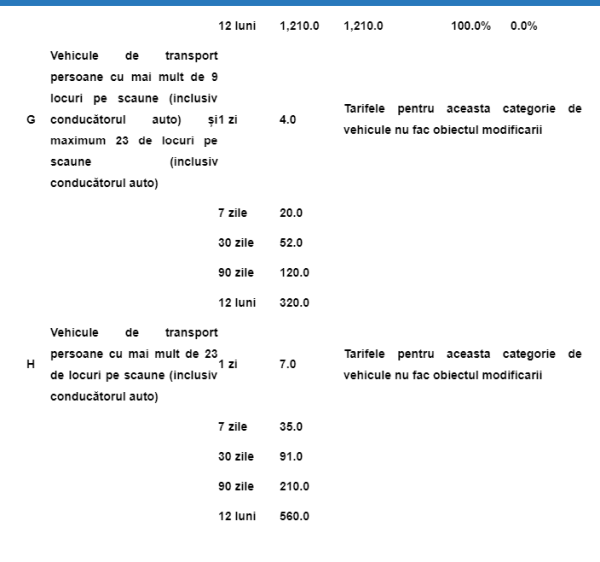 Tarifele pentru celelalte categorii de vehicule, A, B, G si H, nu au fost modificate, nefăcând obiectul de aplicare al Directivei.