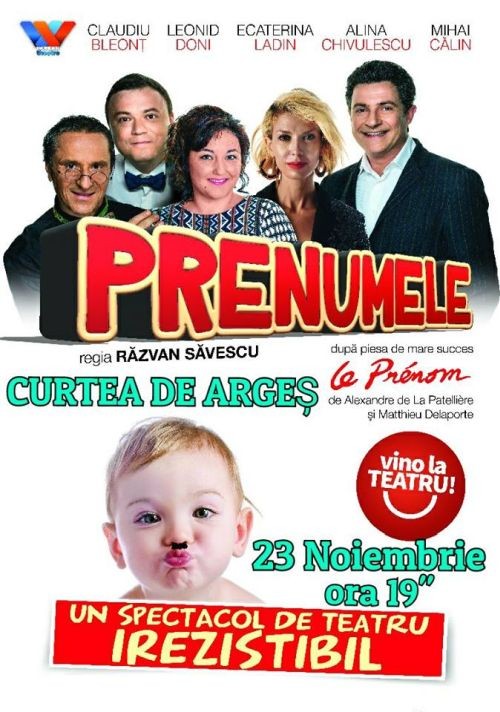 Joi, 23 noiembrie, de la orele 19.00, pe scena Centrului de Cultură și Arte „George Topîrceanu” îi puteți vedea pe actorii Claudiu Bleonț, Leonid Doni, Ecaterina Ladin, Alina Chivulescu și Mihai Călin, în piesa de teatru ”Prenumele”.