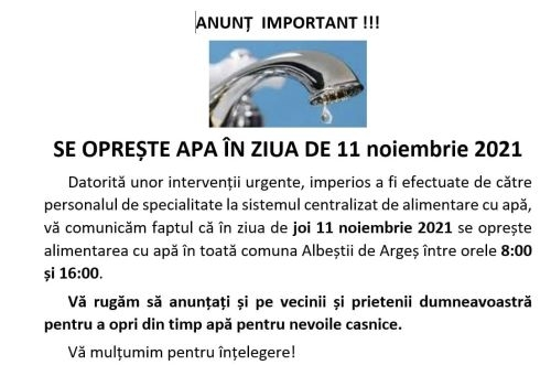 Datorită unor intervenții urgente, imperios a fi efectuate de către personalul de specialitate la sistemul centralizat de alimentare cu apă, vă comunicăm faptul că în ziua de joi 11 noiembrie 2021 se oprește alimentarea cu apă în toată comuna Albeștii de Argeș între orele 8:00 și 16:00.