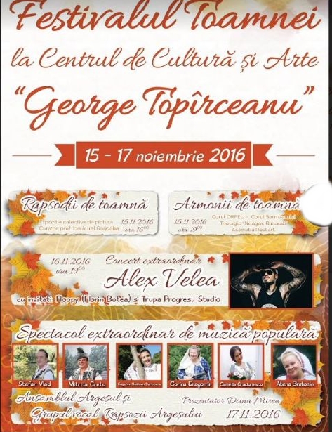 În perioada 15 – 17 noiembrie, la Centrul de Cultură și Arte ”George Topîrceanu” se organizează o serie de evenimente culturale și artistice în cadrul ”Festivalului Toamnei”.