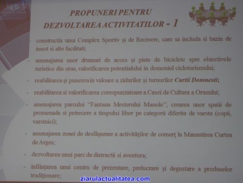 După ce s-au prezentat, pe fiecare capitol, datele ce vor sta la baza strategiei de dezvoltare a municipiului, consilierul local Mădălin Marinescu a venit cu o serie de propuneri: ”înainte de a discuta despre punctele forte sau cele slabe ale traficului din Curtea de Argeș, trebuia făcut un studiu de trafic, ca să fim în perfectă cunoștință de cauză referitor la situația din teren. Am văzut în expunere, trecută la puncte forte și slabe, stația de epurare. Aici datele ar trebui să fie mult mai ample, pentru că este un subiect care cere rezolvare imediată. Un alt capitol care necesită o atenție aparte este motivul pentru care companiile au ales să vină la Curtea de Argeș și anume, forța de muncă calificată, în care s-a investit timp de zeci de ani.