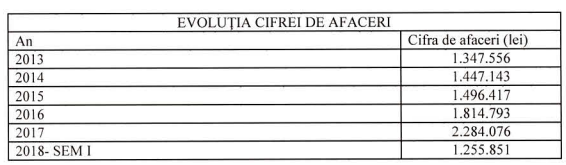 Cifra de afaceri a societatii a crescut progresiv de la an la an, ajungând in anul 2017 la valoarea de 2.284.076 lei.