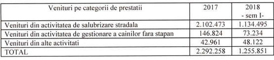 In semestrul I al anului 2018 s-au realizat venituri din activitatea de salubrizare in sumd de 1.134.495 lei, reprezentand 90,34 % din total venituri, 73.234 lei venituri din activitatea de gestionare a cainilor fara stapan , 5,83 % , restul de 3,83% reprezentand alte venituri care au fost in valoare de 48.122 lei.