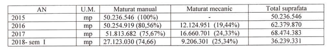 Lucrarile de maturat manual a căilor publice au crescut in anul 2017 fată de anul 2016 cu 1.558.763 mp, reprezentand o crestere de 3,10 %, iar in sem. I al anului 2018 s-a salubrizat o suprafata de 27.123.030 mp.