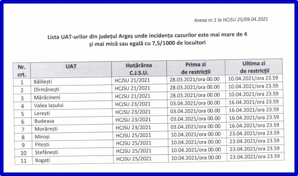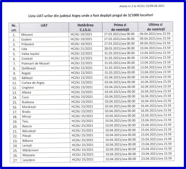 Conform datelor furnizate de DSP Argeș, vineri, 9 aprilie 2021, incidența cazurilor la mia de locuitori este următoarea: