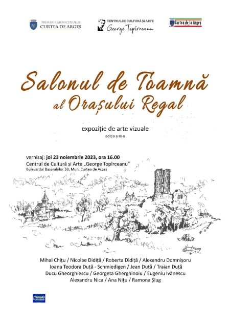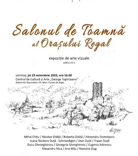 Mâine vă invităm la Salonul de Toamnă al Orașului Regal, o manifestare culturală în cadrul căreia artiștii plastici din Curtea de Argeș expun împreună pe simezele Centrului de Cultură și Arte George Topîrceanu.